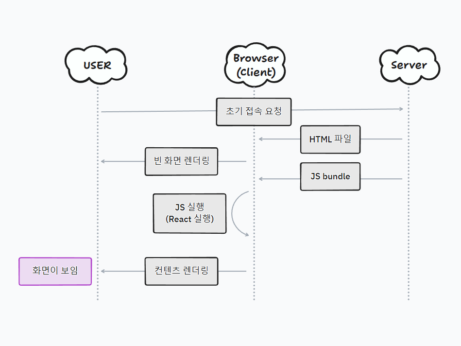 기본적으로 React 앱은 CSR 방식을 사용한다. 이 방식에서는 모든 렌더링 작업이 브라우저에서 이루어지며, 서버에서 제공되는 최소한의 HTML에 자바스크립트 코드가 추가되어 전체 애플리케이션이 작동하게 된다.